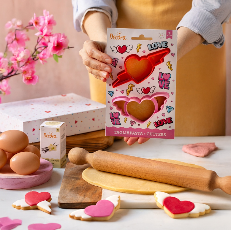 Set 2 decupatoare din plastic include formele: Inimă cu aripi (10 x 5 x 2,2 cm) și Inimă cu săgeată (12 x 5 x 2,2 cm).