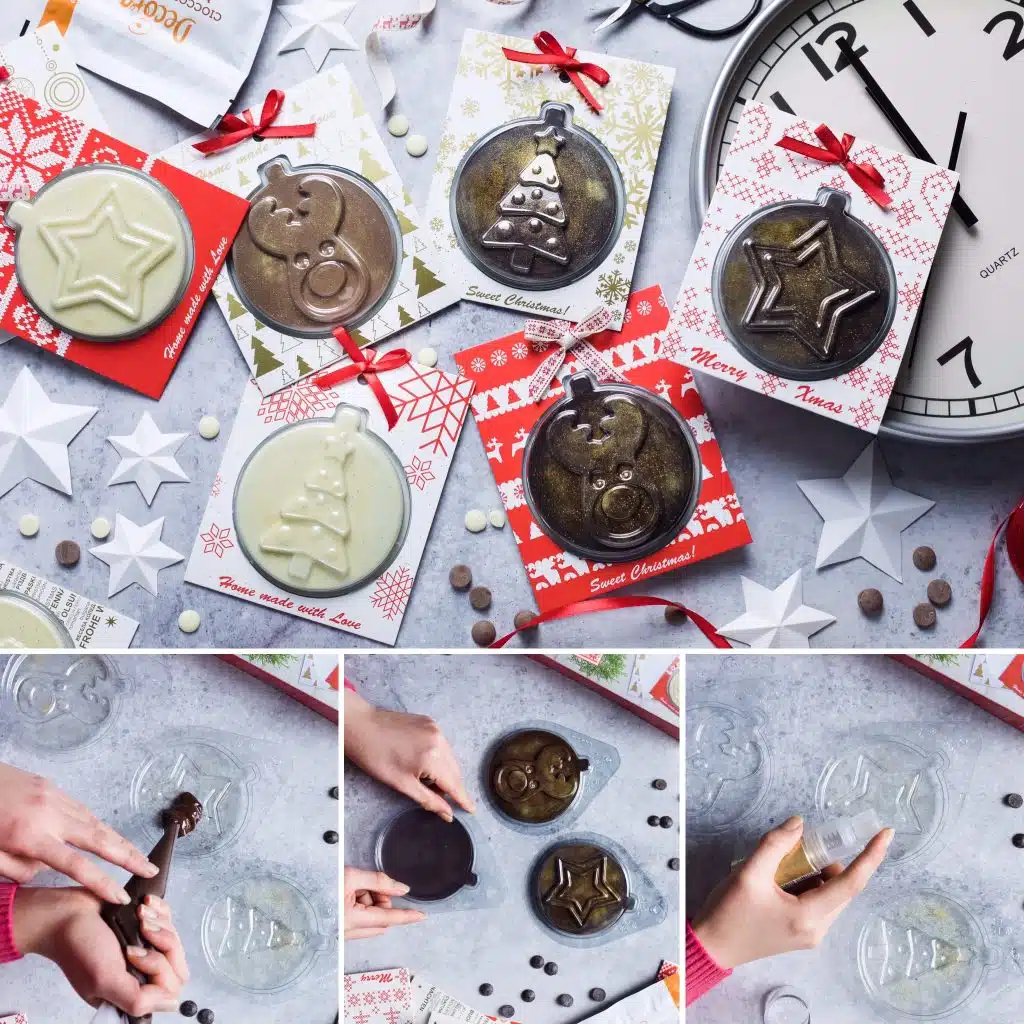 Un set unic și ușor de utilizat pentru a crea cadouri de Crăciun originale! Realizează cartoline de sărbători umplute cu ciocolată, perfecte pentru personalizarea cadourilor sau pentru decorarea casei. Pot fi agățate cu ușurință de bradul de Crăciun.