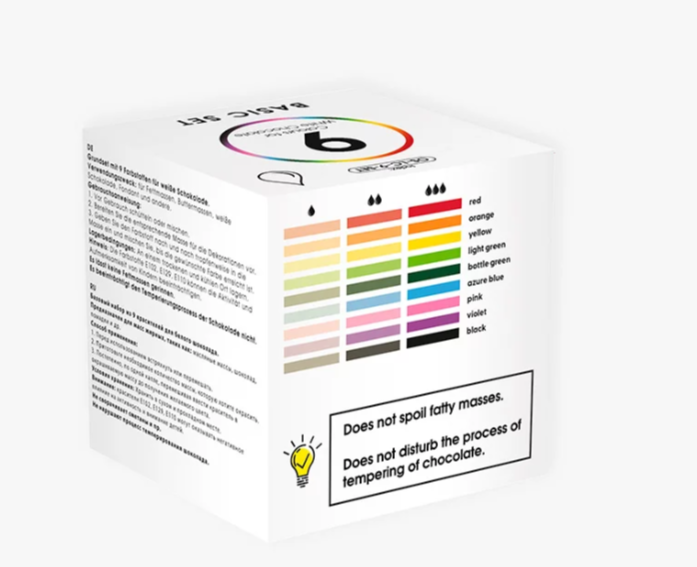 Set profesional de 9 emulsii colorante intens saturate, special concepute pentru colorarea ciocolatei albe și a maselor grase (unt de cacao, glazuri, creme pe bază de grăsimi). Formula sub formă de emulsie permite încorporare ușoară și omogenă, fără a afecta textura sau stabilitatea produsului final. Dozarea este precisă datorită ambalajului tip picurător.
