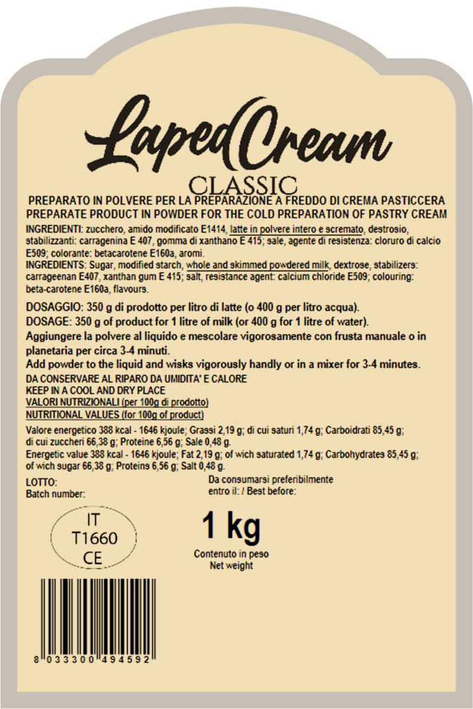 Această pudră este un preparat sub formă de pudră, ușor și rapid de utilizat, care, amestecat cu apă sau lapte, permite obținerea în doar câteva minute a unei creme de patiserie instant, cu gust fin de vanilie, fără postgust de pudră.
